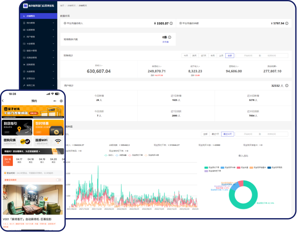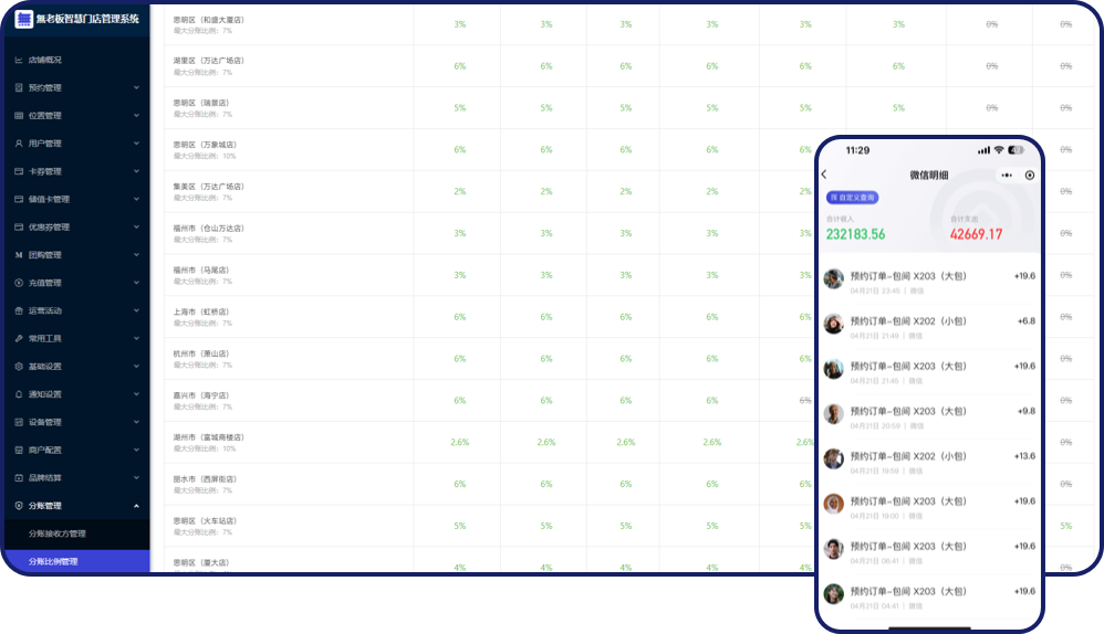 统一管理所有门店资金【预消费类】,充值、储值卡、卡券等跨店门店消费项目,且支持按比例结算各门店所占消费比例